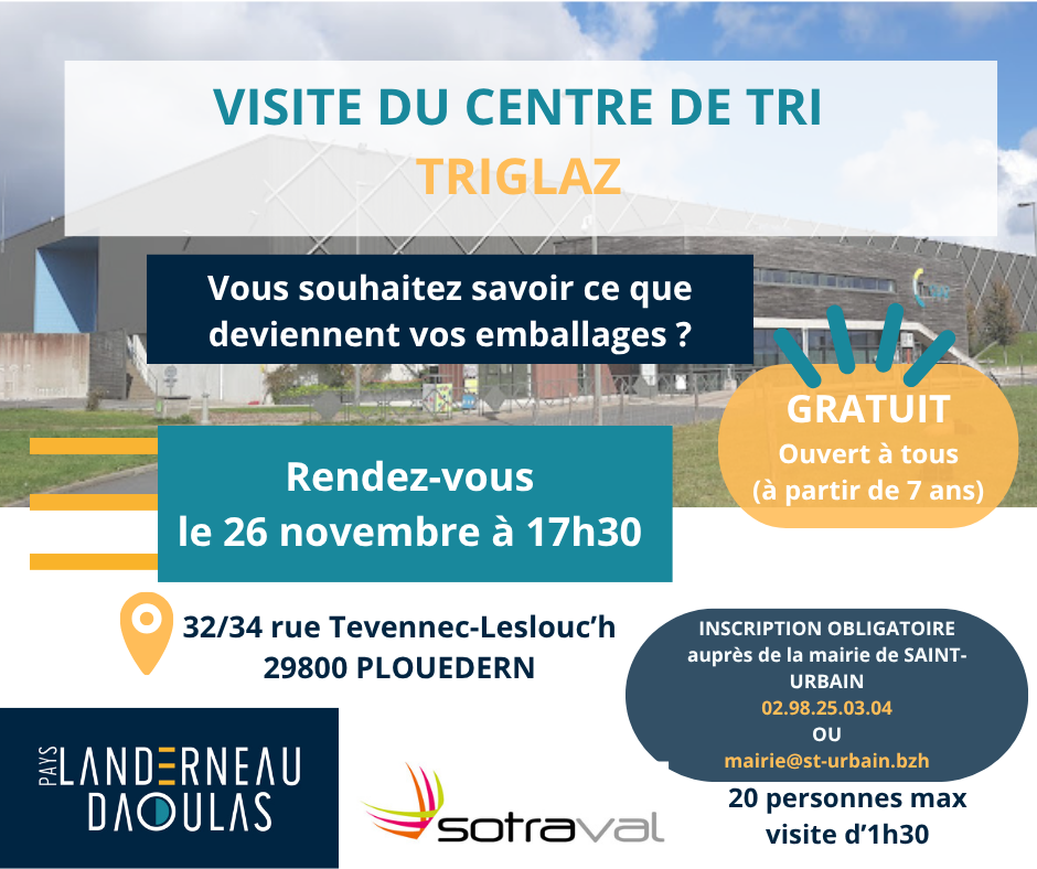 Dans le cadre d'une action de sensibilisation à la gestion des déchets, le service environnement de la Communauté d'Agglomération du Pays de Landerneau Daoulas organise une visite d'environ 1h30 du centre de tri TRIGLAZ de Plouédern le mercredi 26 novembre à 17h30.